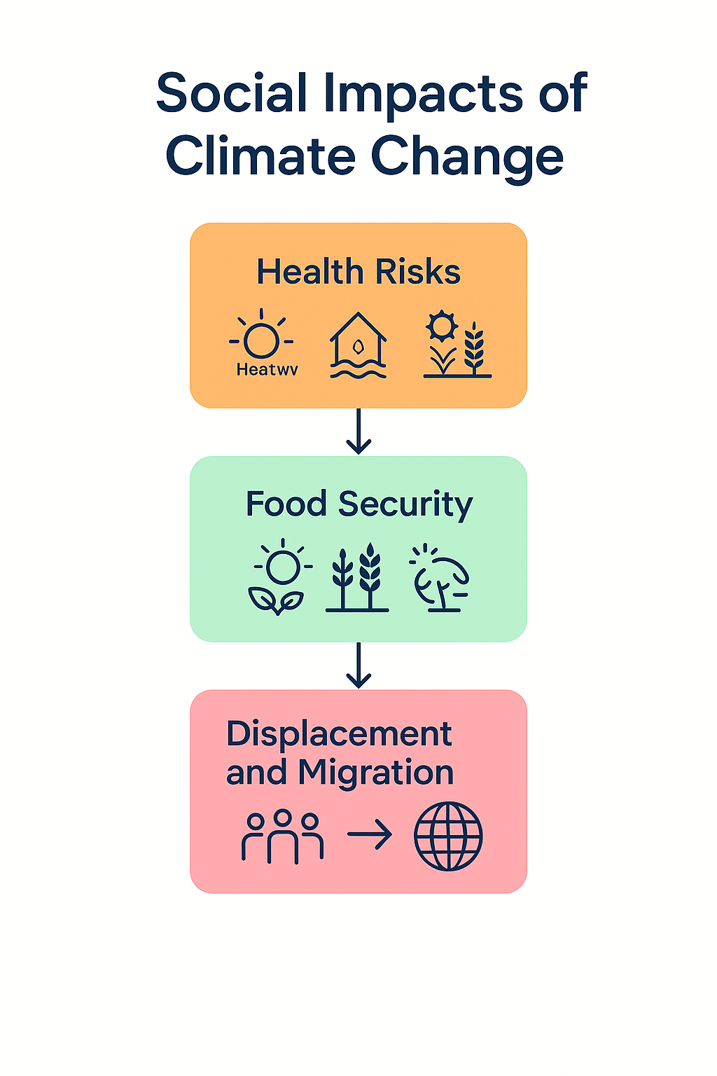 Climate change has profound and far-reaching social implications. It threatens to exacerbate existing inequalities within and between societies. Vulnerable populations, including those with low incomes, the elderly, and marginalized groups, are often the most affected by the consequences of a changing climate. These consequences can include: